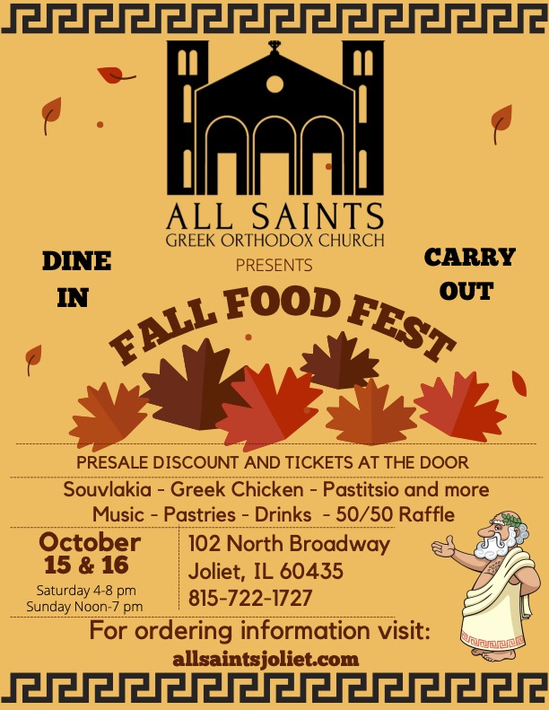 All Saints Greek Orthodox Church will be hosting “Fall Food Fest” at 102 North Broadway in Joliet, on Saturday, October 15th from 4-8 PM, and on Sunday, October 16th from noon to 7 PM. The event will feature Greek food, such souvlaki, Greek-style chicken, and pastitsio, as well as drinks and desserts. There will be a raffle and live music at the event, too.